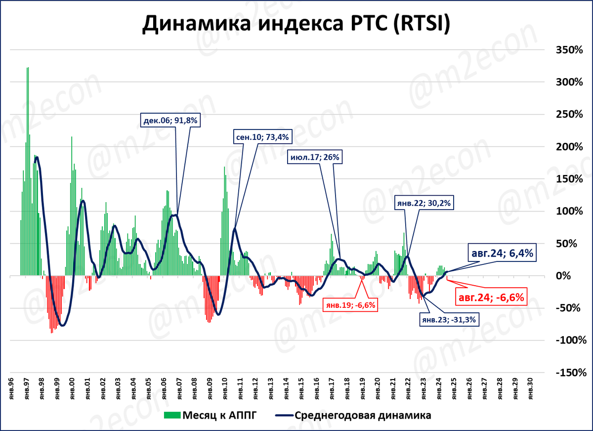 Индекс РТС начал падать в годовом выражении. Это первый месяц падения после 8 месяцев роста подряд.