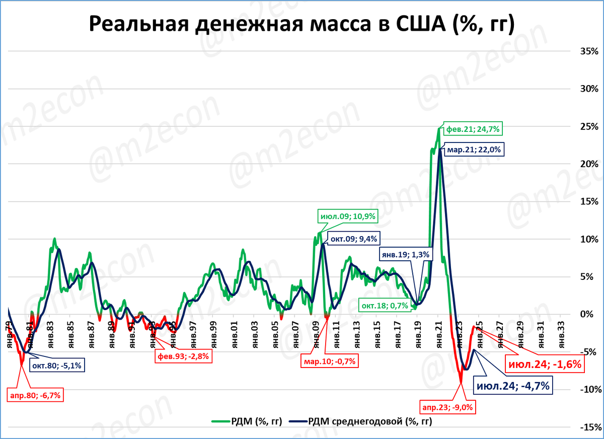 США: денежная масса (номинальная) растёт четвёртый месяц подряд. Рост денежной массы отстаёт от роста цен. Это значит, что реальная денежная масса (РДМ) сжимается: -1,3% по итогам июля. При этом ВВП США продолжает расти: +3,1% по итогам 2 квартала 2024 года.