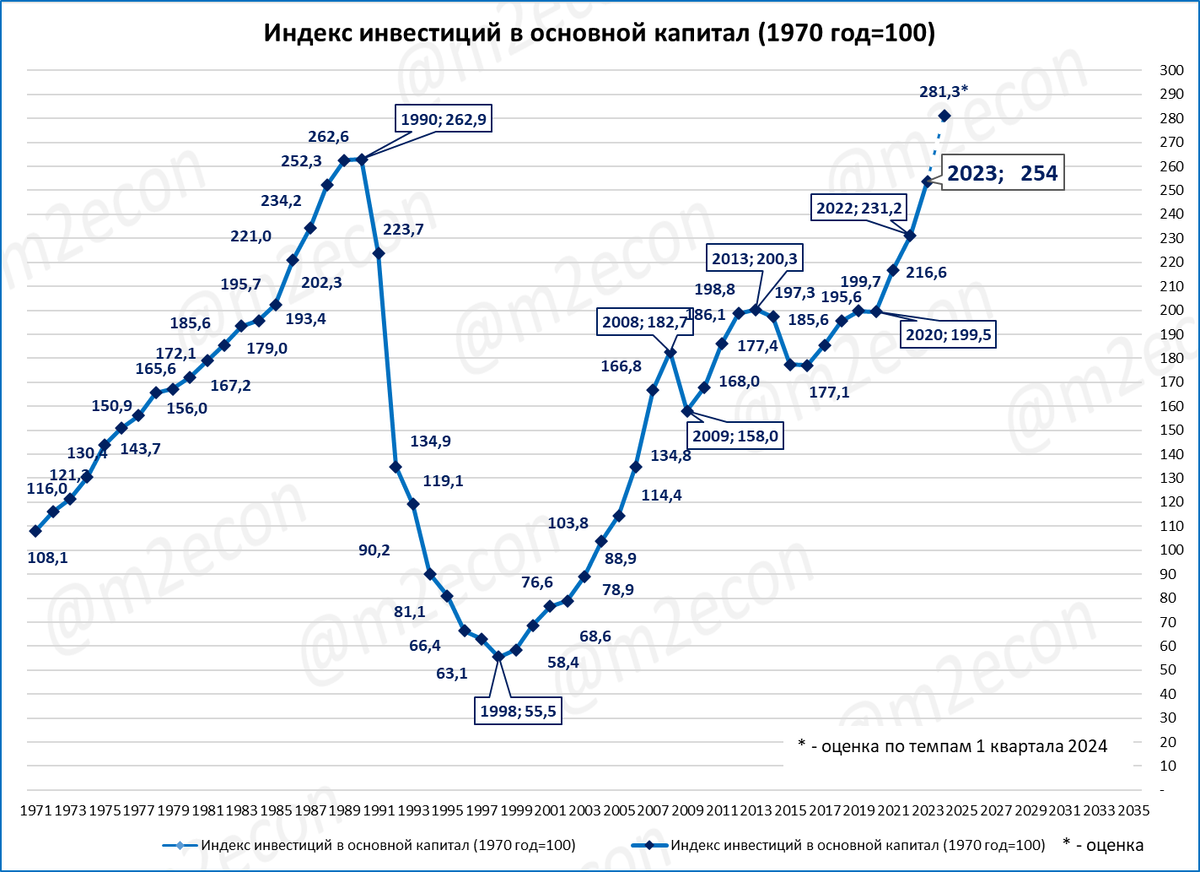 Если темп первого полугодия сохранится до конца года, то инвестиции в 2024 году составят 281% от уровня 1970 года (см. график).