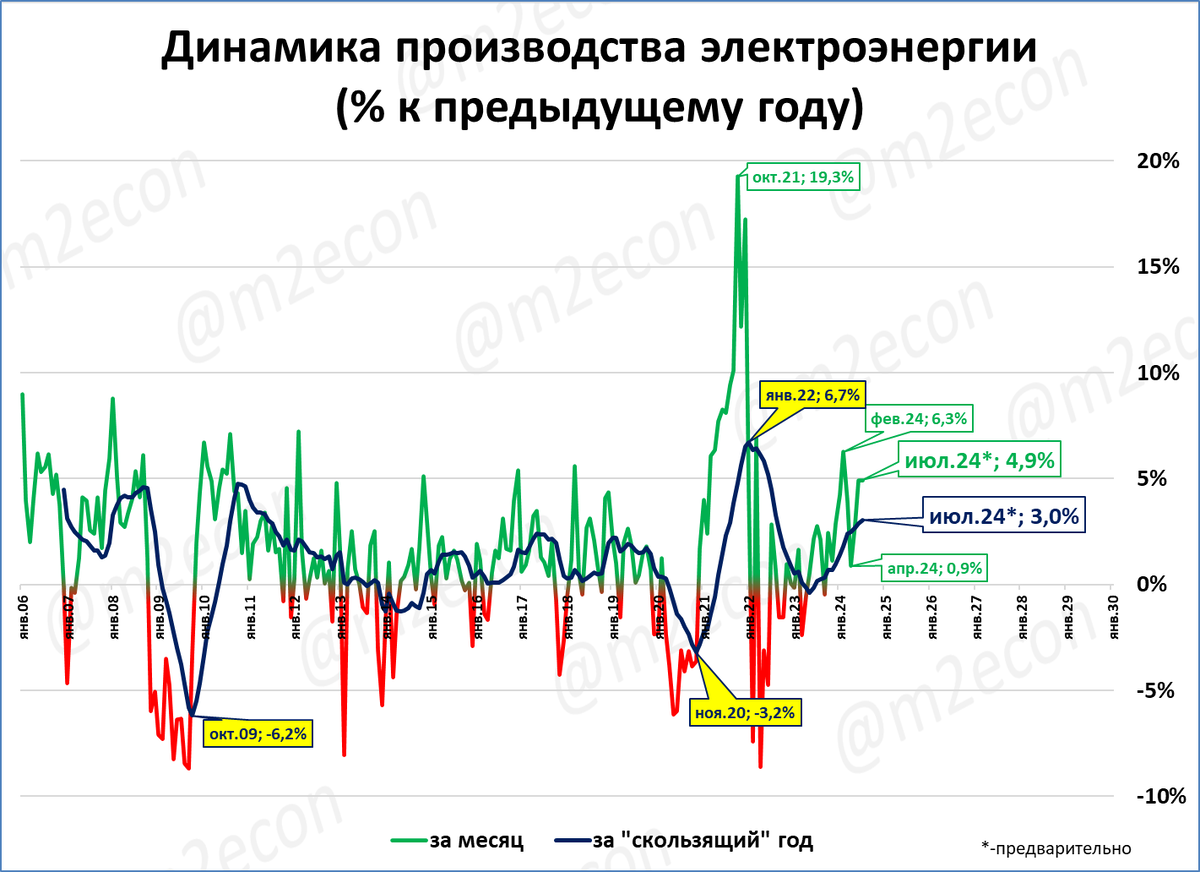 Если темп (4,0%) сохранится до конца года, то в 2024 году будет установлен новый исторический рекорд производства электроэнергии.