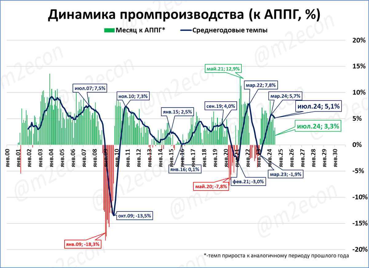 Промпроизводство (это около 30% ВВП) в июле выросло на 3,3%. Промпроизводство за последние 12 месяцев (скользящий год) установило новый рекорд.