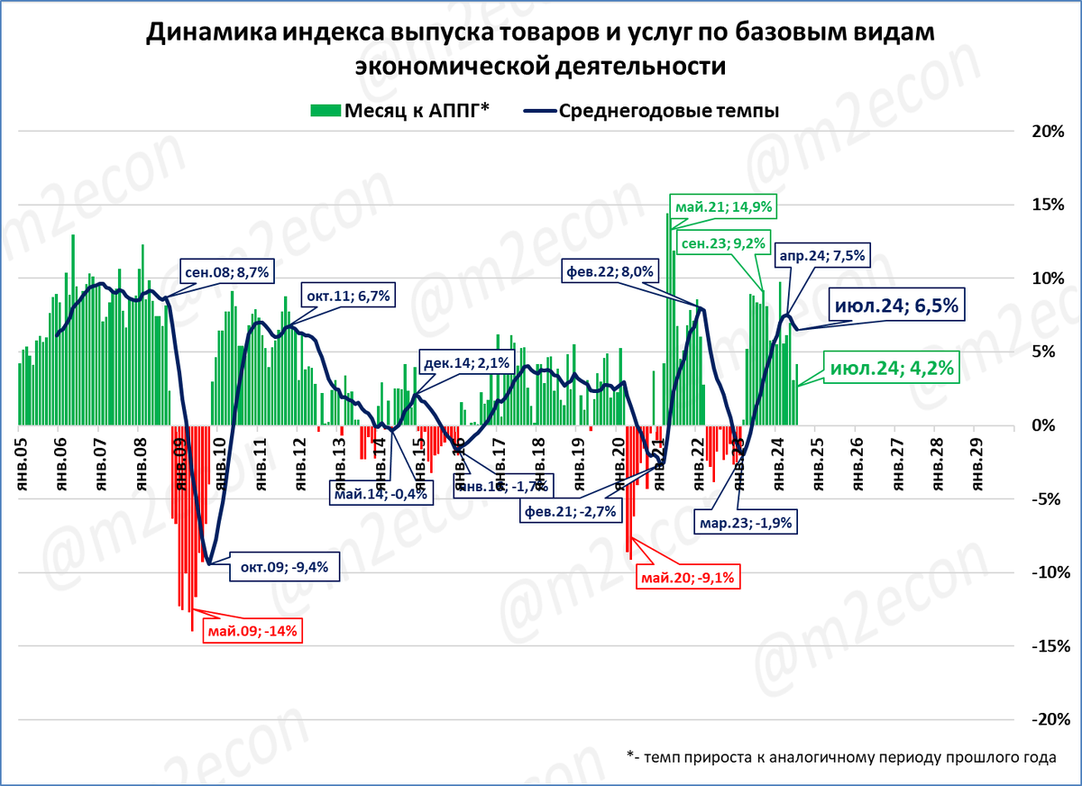 Выпуск базовых отраслей (ВБО; это около 60% ВВП; кроме промпроизводства включает в себя сельское хозяйство, строительство, транспорт и торговлю) в июле вырос 4,2% к июлю прошлого года.