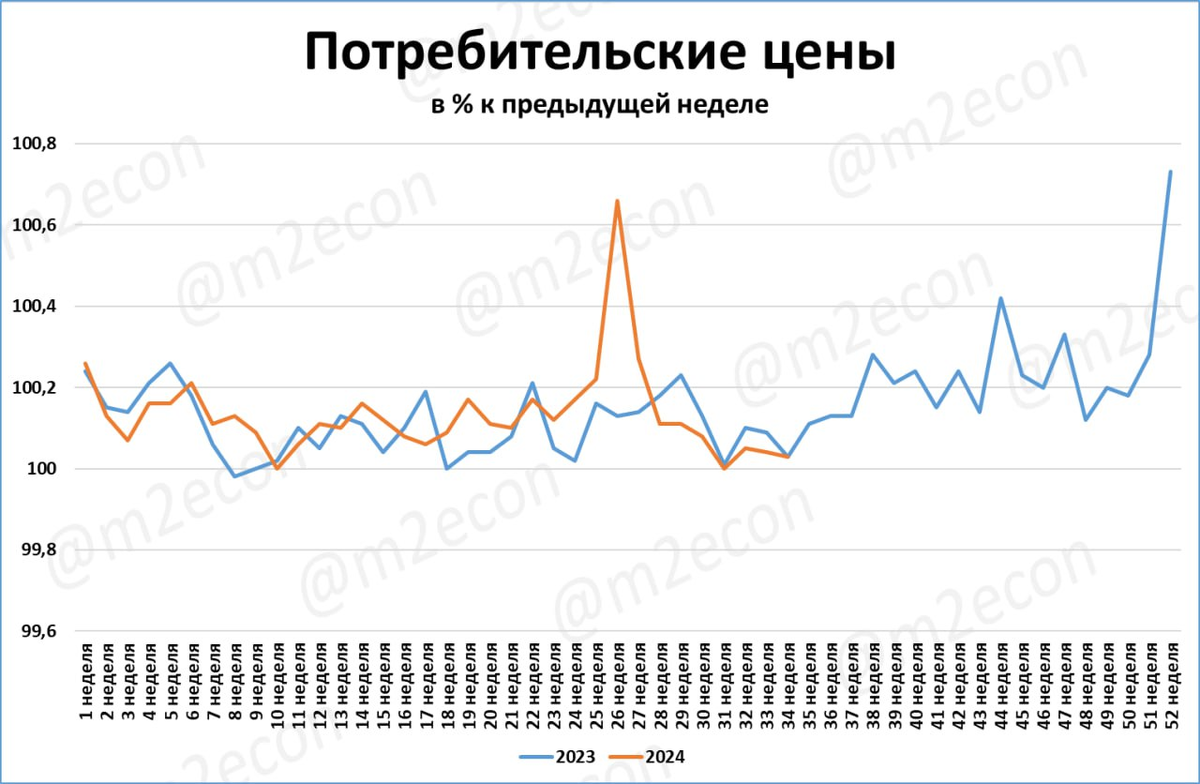 Шесть недель инфляция была ниже прошлогоднего уровня. На 34 неделе она уже на уровне прошлогодней (0,03% за неделю).