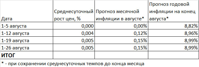 Если так будет до конца месяца, то по итогам августа инфляция составит 9,0% годовых.