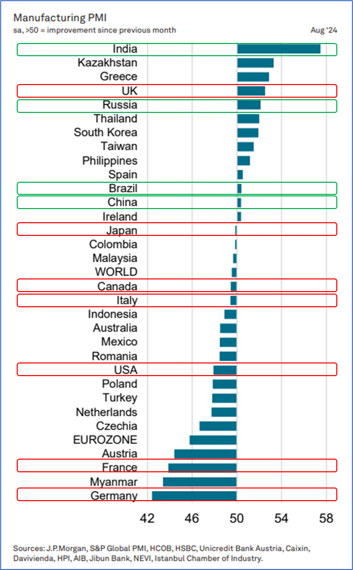 В целом картина нескольких последних месяцев стабильна: активность растёт в странах БРИК и падает в большинстве стран G7.