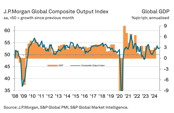 Рост деловой активности в целом по мировой экономике (промышленность+услуги) продолжается 19-й месяц подряд, с февраля 2023 года, благодаря росту в секторе услуг.
