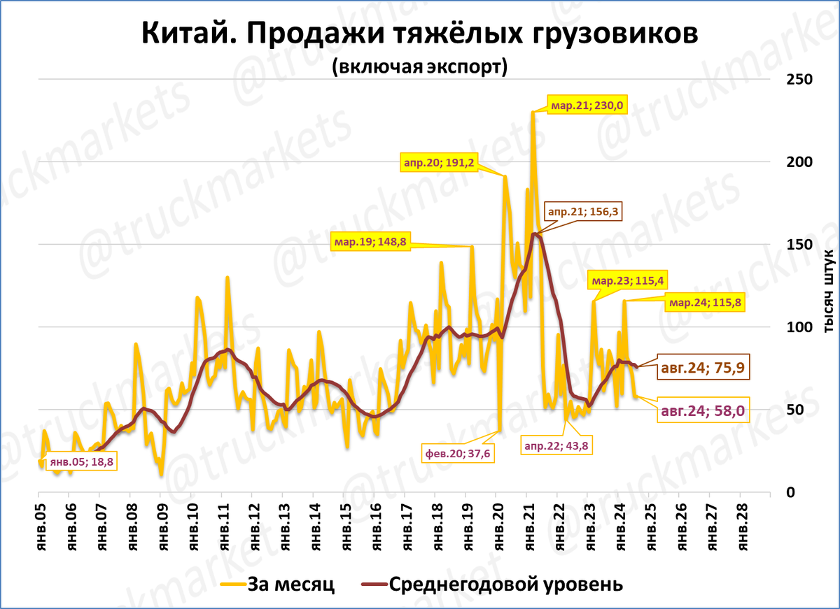 В августе китайские производители продали 58 тыс. тяжёлых грузовиков (внутренний рынок + экспорт).