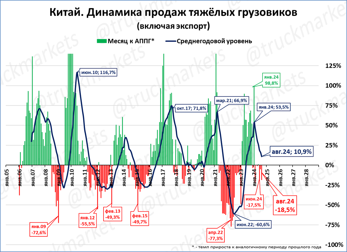Оценка: падение рынка тяжёлых грузовиков выглядит сильным только на фоне августа прошлого года, который стал лучшим месяцем за последние 16 лет (см. жёлтую выноску на первом графике).