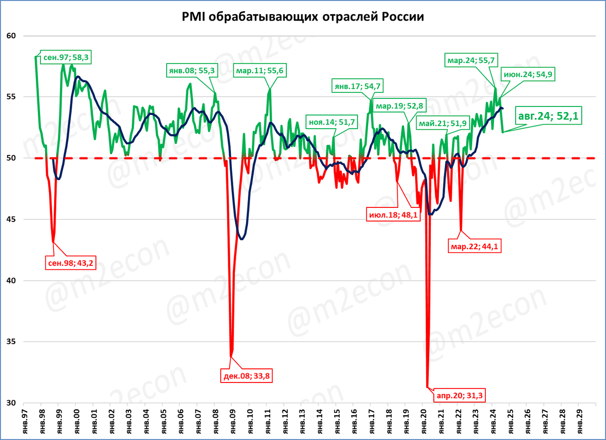 PMI в обрабатывающей промышленности снизился в августе до 52,1 пункта, но находится выше 50 пунктов (=рост деловой активности).