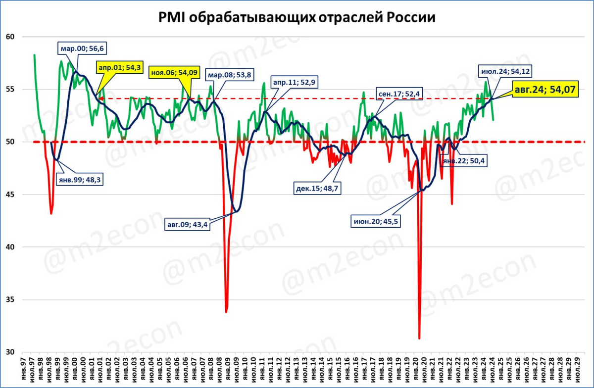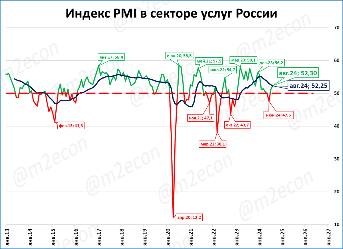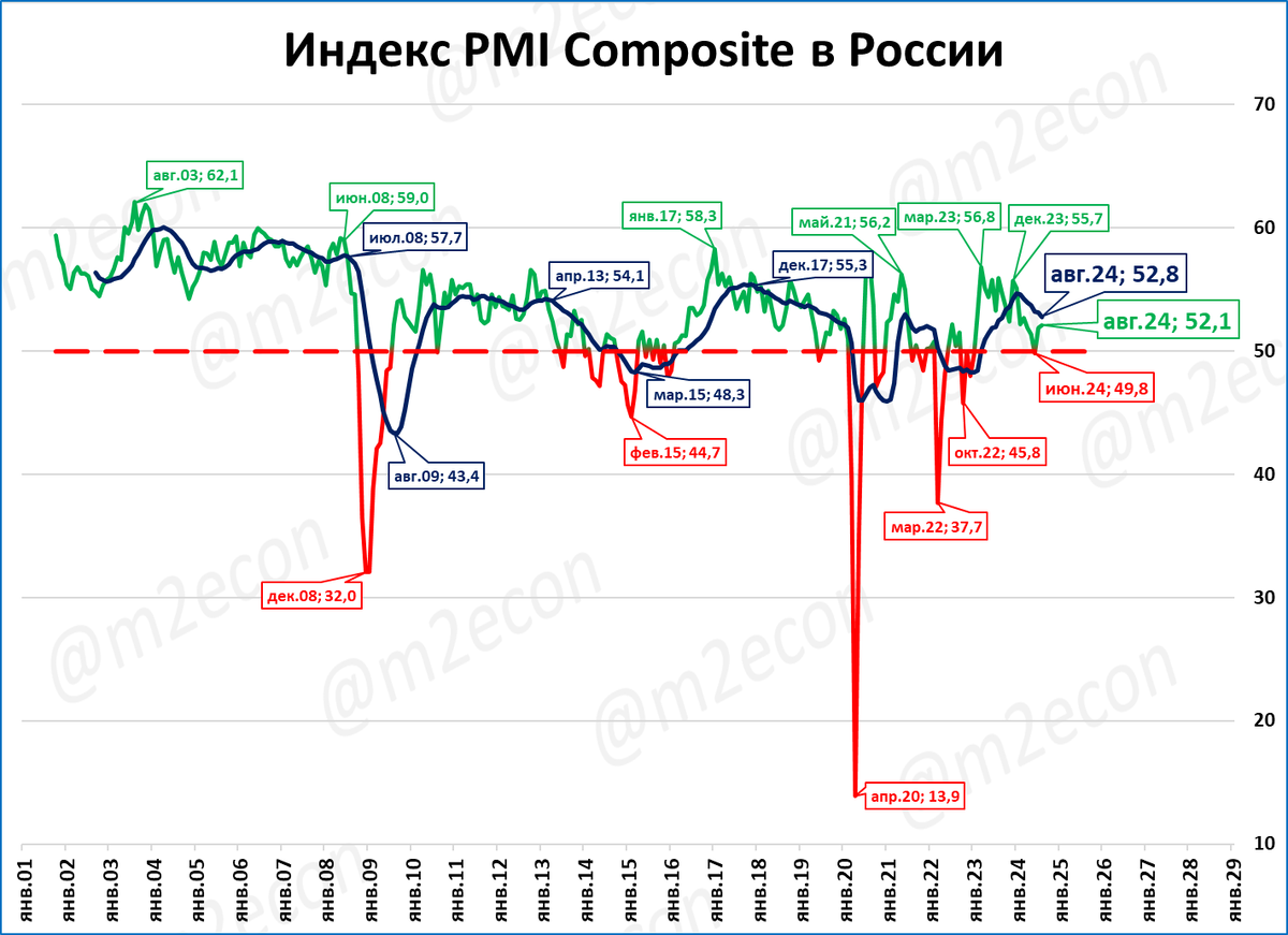 Композитный индекс PMI (промышленность + услуги) в августе составил 52,1 пункта. Это говорит о росте деловой активности в экономике России в целом.
