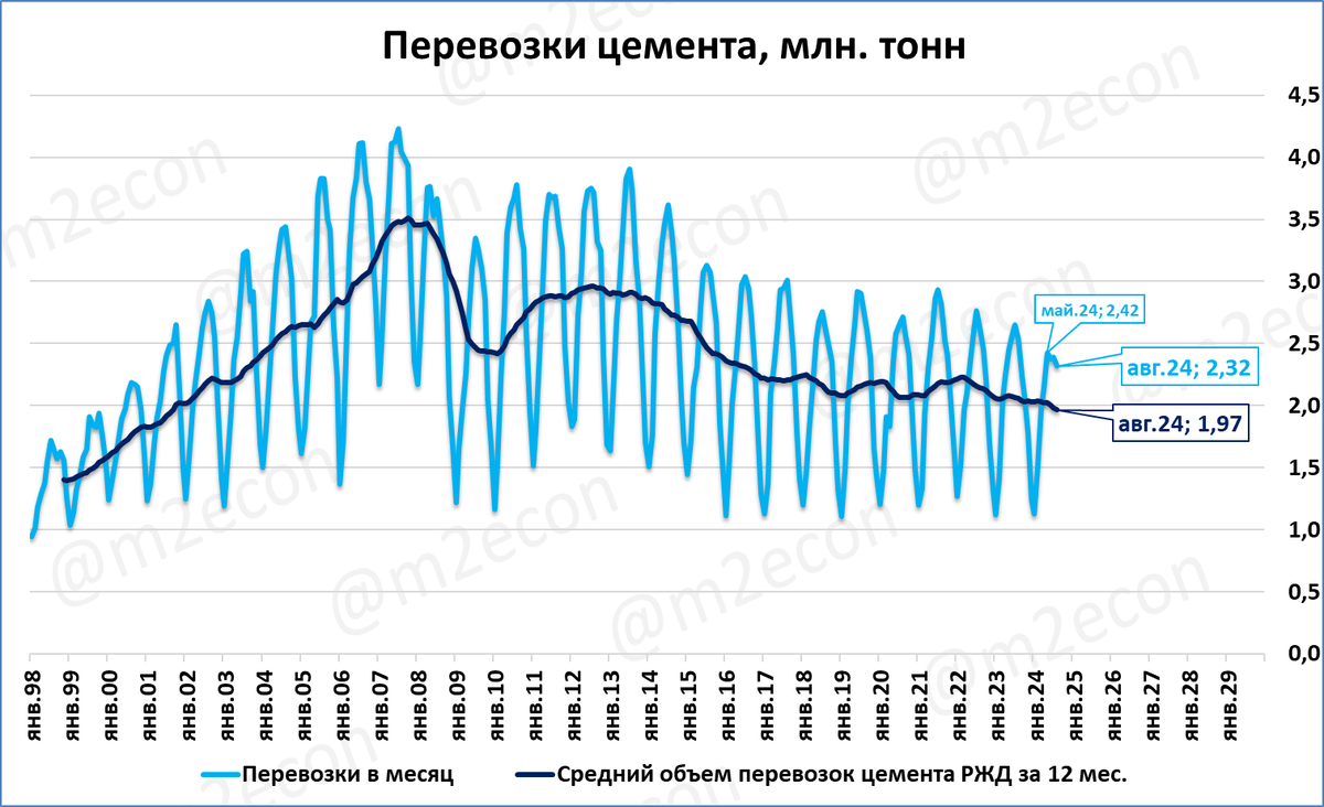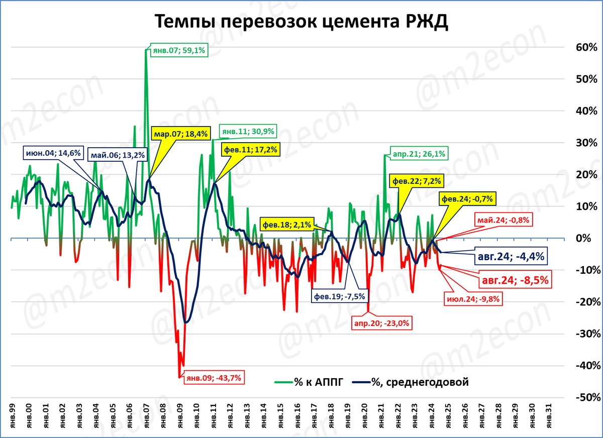 Таким образом, перевозки цемента стабилизировались на уровне 23-летней давности (2001 года).