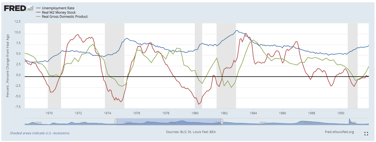 Потому что реальная денежная масса (РДМ) сжималась, а не росла, как до 1960-х.