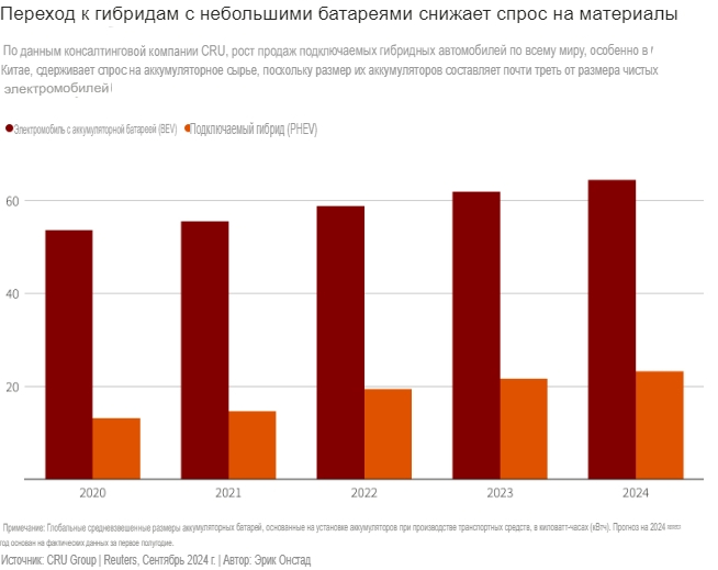 «Возврат на гибридные автомобили с подзарядкой и снижение востребованности электромобилейс аккумуляторными батареями, вероятно, в целом негативно скажется на росте спроса на материалы для аккумуляторов в течение следующих нескольких лет», — сказал Сэм Адхам, руководитель отдела материалов для аккумуляторов в CRU.