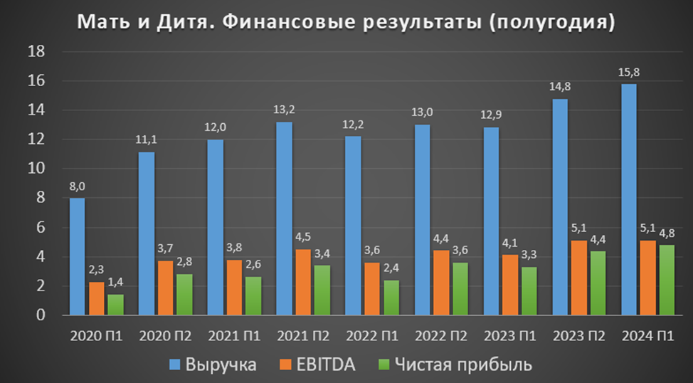 1П 2024 лучше, как г/г, так и к прошлому полугодию. Вообще на диаграмме виден планомерный рост финансовых результатов, обеспеченный расширением медицинской сети.