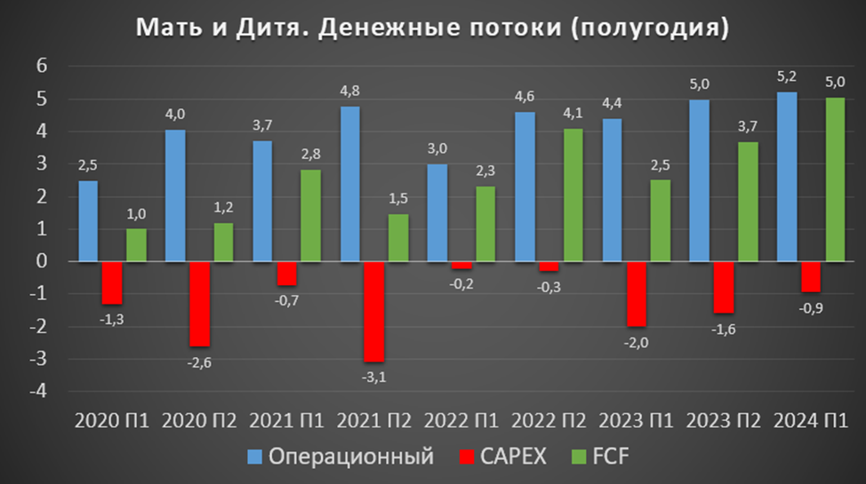 В 1П 2024 операционный поток рекордный благодаря рекордной ЧП. А т.к. капитальные затраты были относительно невысокие, FCF также рекордный +5 млрд.