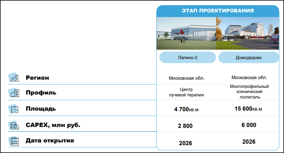 А в 2026 году запланировано открытие госпиталей в Московской области: «Лапино-3» и «Домодедово». Здесь уже капексы высокие, но они разнесены по времени.