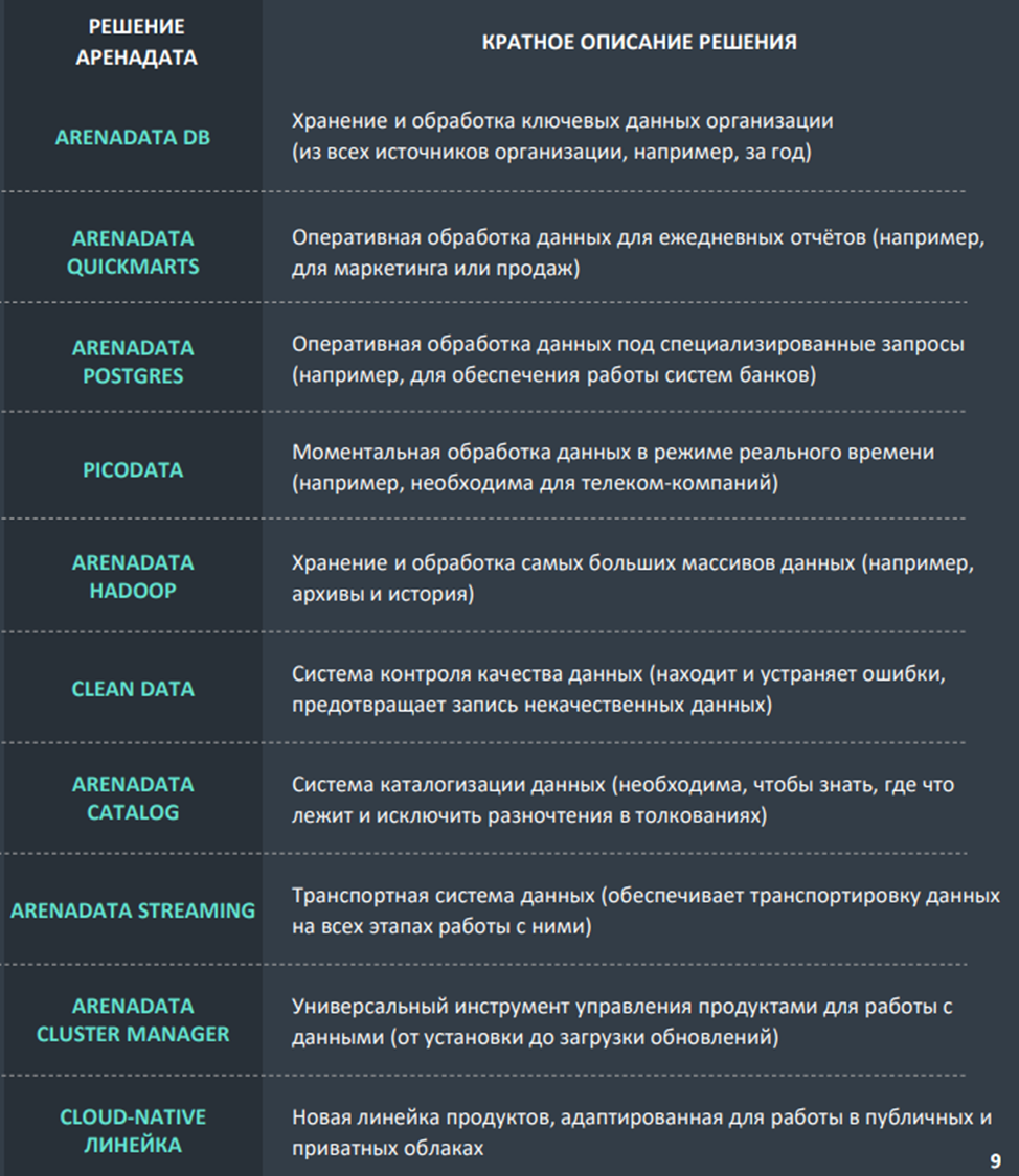 Группа Arenadata — ведущий российский разработчик на рынке систем управления и обработки данных. Занимает лидирующие позиции на российском целевом рынке в сегменте аналитических СУБД и по количеству коммерческих внедрений.