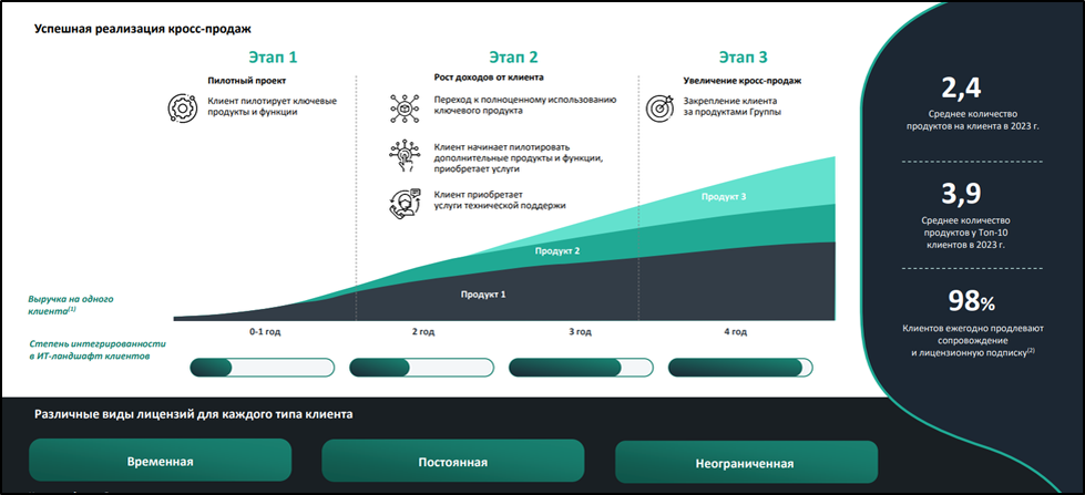 Основная выручка Группы формируется за счет продажи лицензий (более 70%). Далее клиенты докупают дополнительные лицензии по мере роста объемов данных. Также есть платная тех поддержка и обучение.
