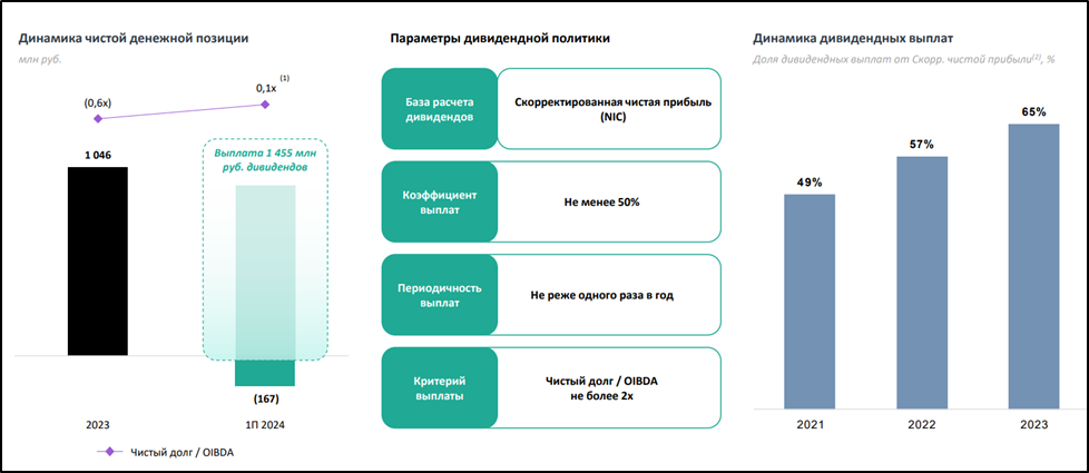 Дивидендная политика предусматривает выплаты не менее 50% от скорректированной ЧП при ND/OIBDA < 2.