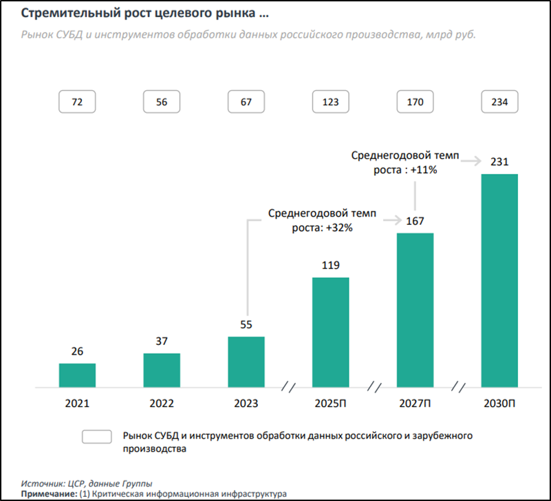 По данным ЦСР (Центр стратегических разработок) ожидается рост рынка СУБД и обработки данных российского производства темпами 32% до 2027 года. И далее по 11% до 2030 года.
