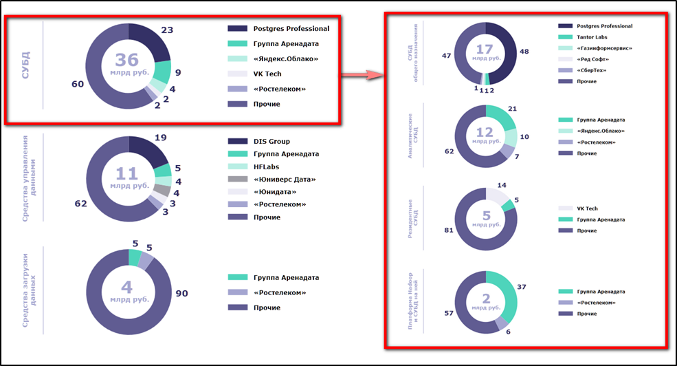 Конкуренция. На российском рынке систем управления и обработки данных много игроков (Postgres Pro, Яндекс, ВК, Ростелеком и т.п.) и позиции Аренадата далеко не подавляющие (доля около 10% на рынке СУБД).