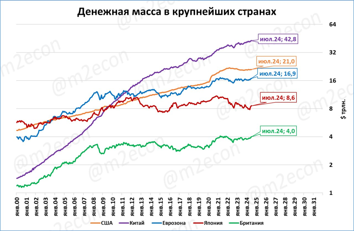 С 2013 года замедлился рост денежной массы Китая и полностью прекратился рост в Японии.