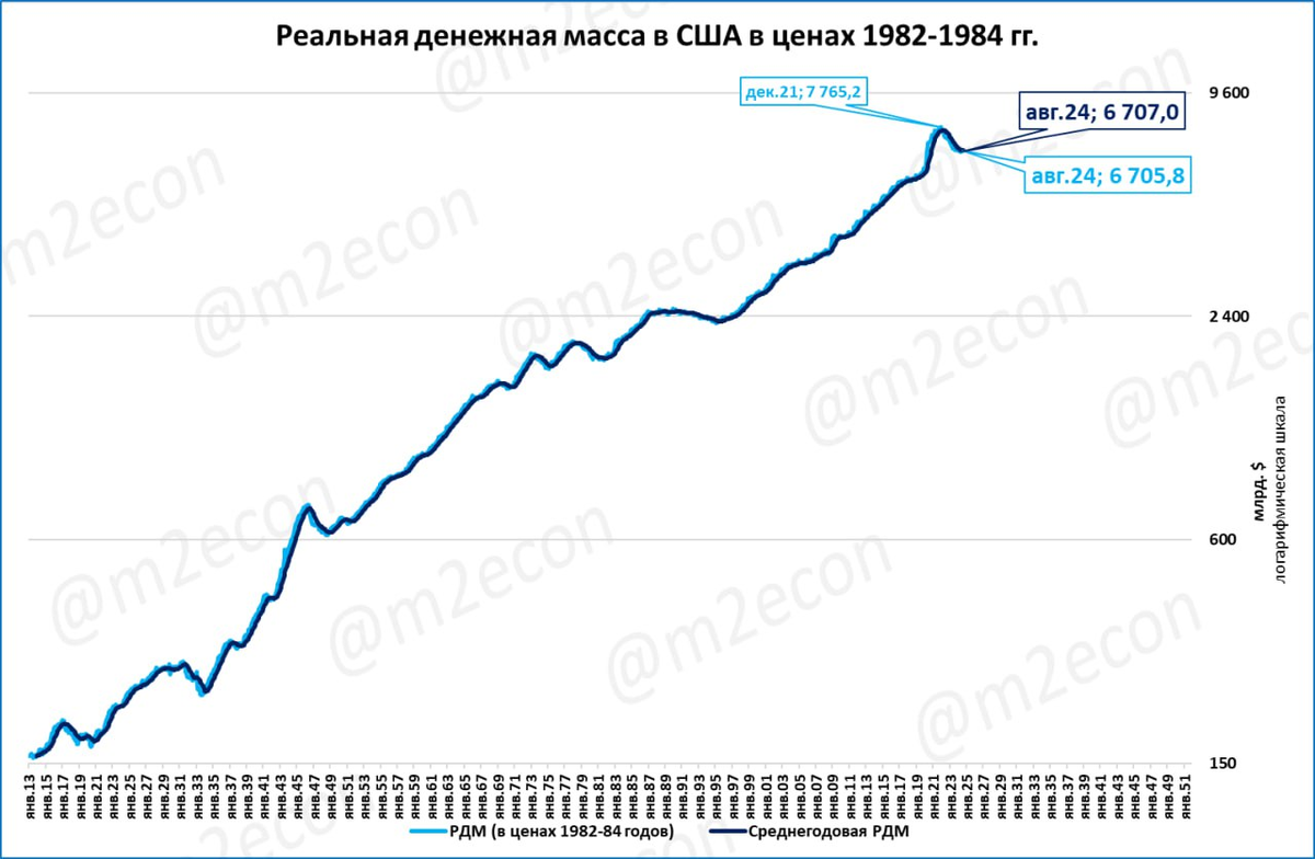 На логарифмической шкале (см. график ниже) всё выглядит так, словно РДМ в США уже опустилась ниже своего многолетнего тренда.