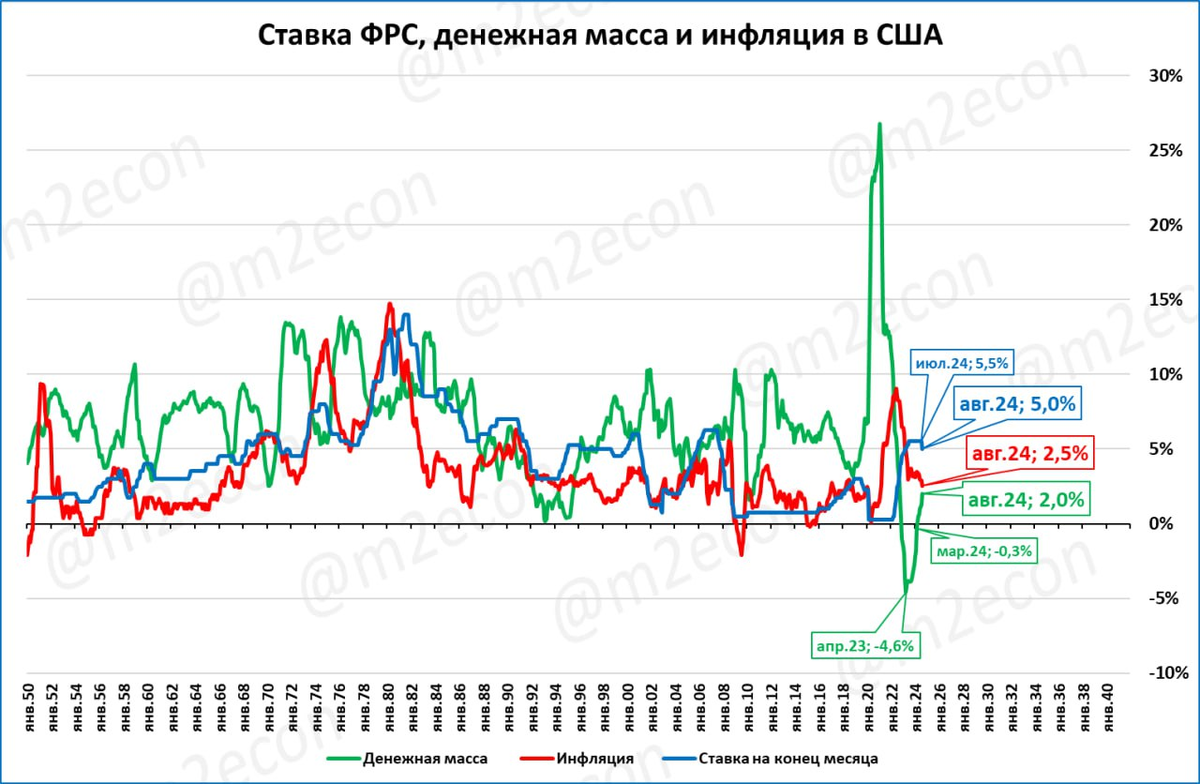 США: денежная масса (номинальная) растёт пятый месяц подряд. Рост денежной массы отстаёт от роста цен. Это значит, что реальная денежная масса (РДМ) сжимается: -0,5% по итогам августа. При этом ВВП США растёт: +3,0% по итогам 2 квартала 2024 года.