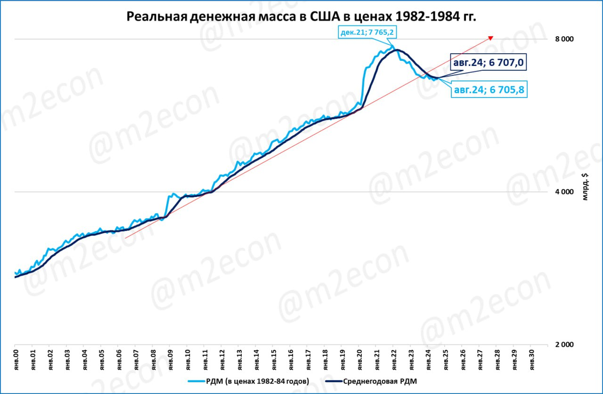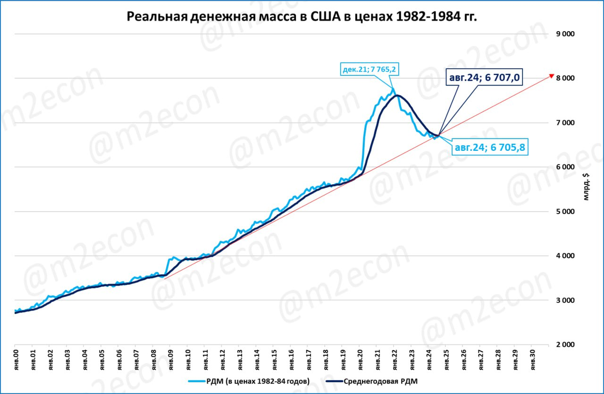 РДМ в США падала. Но это было падение после бурного роста. Выглядит как возвращение к многолетнему тренду, показанному красной стрелкой (линейная шкала).