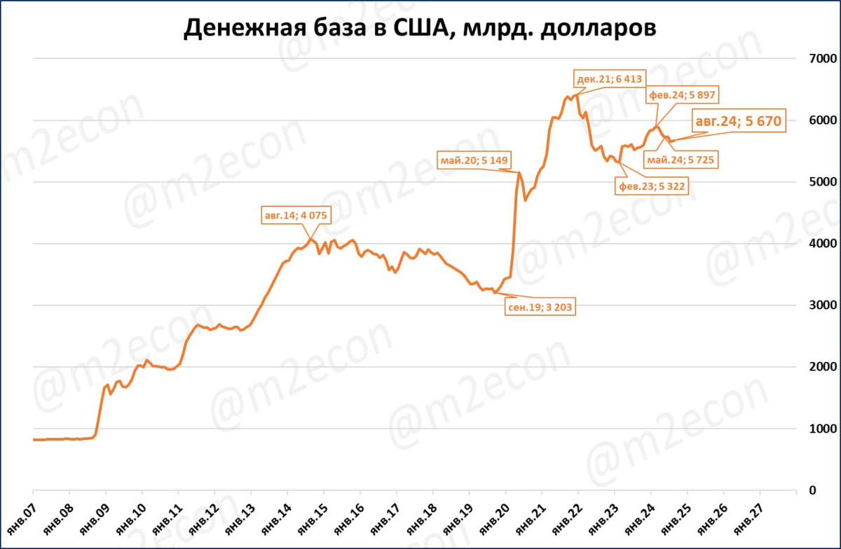 Денежная база в США ниже, чем в конце 2021 года.
