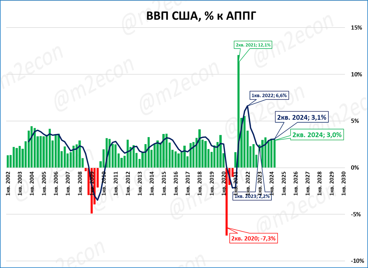 ВВП США во 2 квартале 2024 года вырос на 3,0% ко 2 кварталу 2023 года.