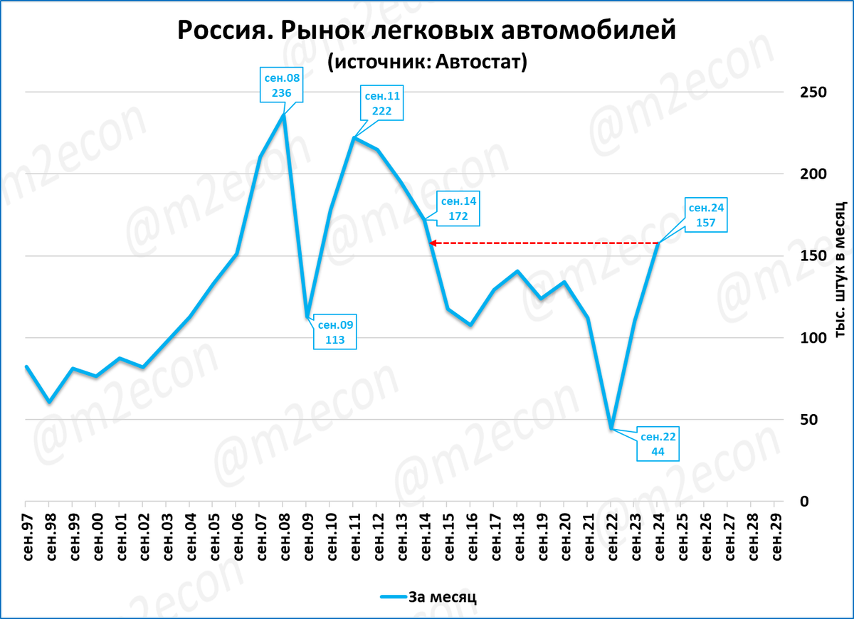 Судя по недельным данным, по итогам сентября рынок легковых может составить 157 тысяч штук. Это будет лучший сентябрь за 10 лет. Ожидаемые итоги года 1,64 млн., это тоже рекорд за десятилетие.