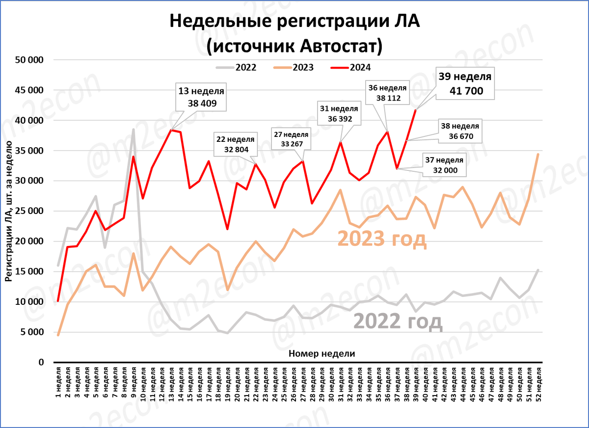 По предварительным данным, на 39 неделе в России было зарегистрировано 41,7 тыс. легковых автомобилей.