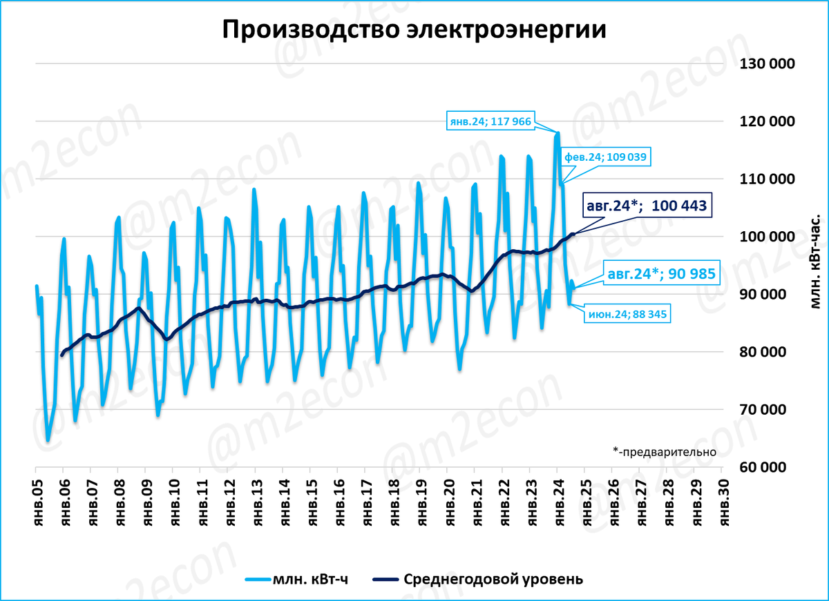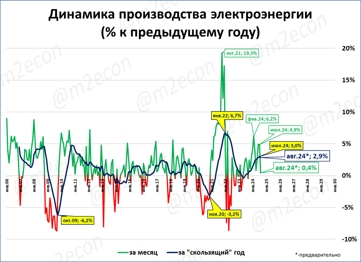 Производство электроэнергии в августе выросло на 0,4%. Несмотря на столь невысокий рост, объём производства за 12-месяцев (скользящий год) установил очередной исторический рекорд.