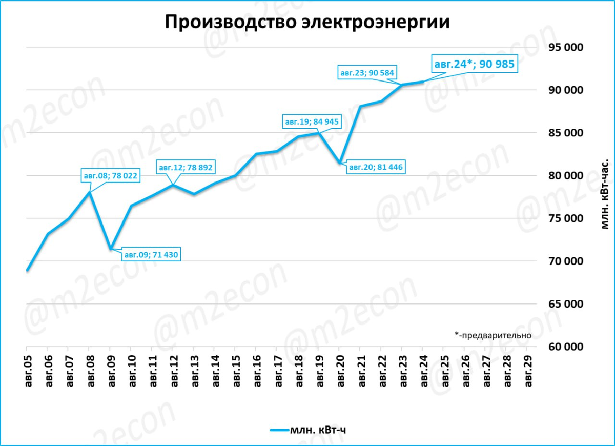 Производство электроэнергии в августе, по предварительным данным, составило 91,0 млрд кВт часов.