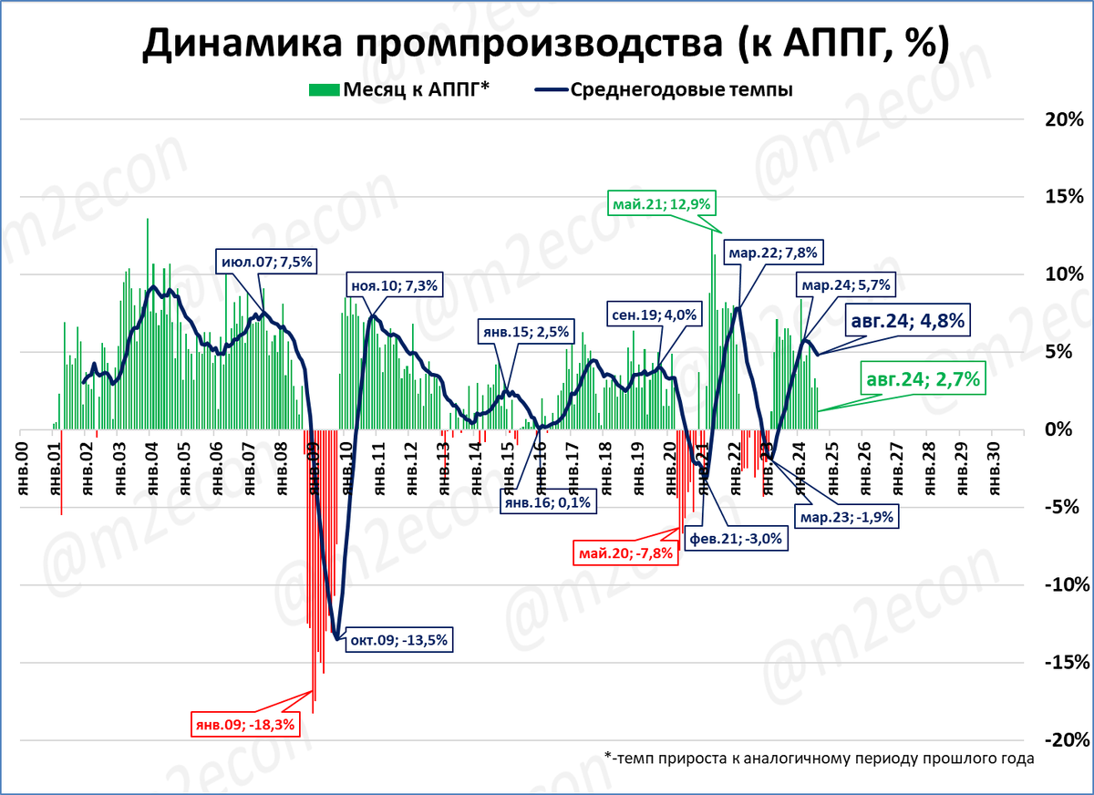 Даже после замедления среднегодовой рост промпроизводства (4,8%) на таком уровне, который в 2013-2020 годах был недостижимым.