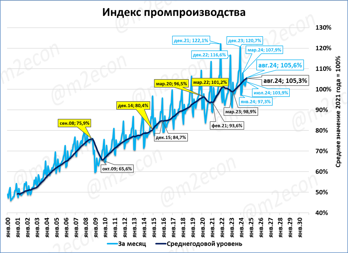 Промпроизводство (это около 30% ВВП) в августе выросло на 2,7%. Промпроизводство за последние 12 месяцев (скользящий год) установило новый рекорд.