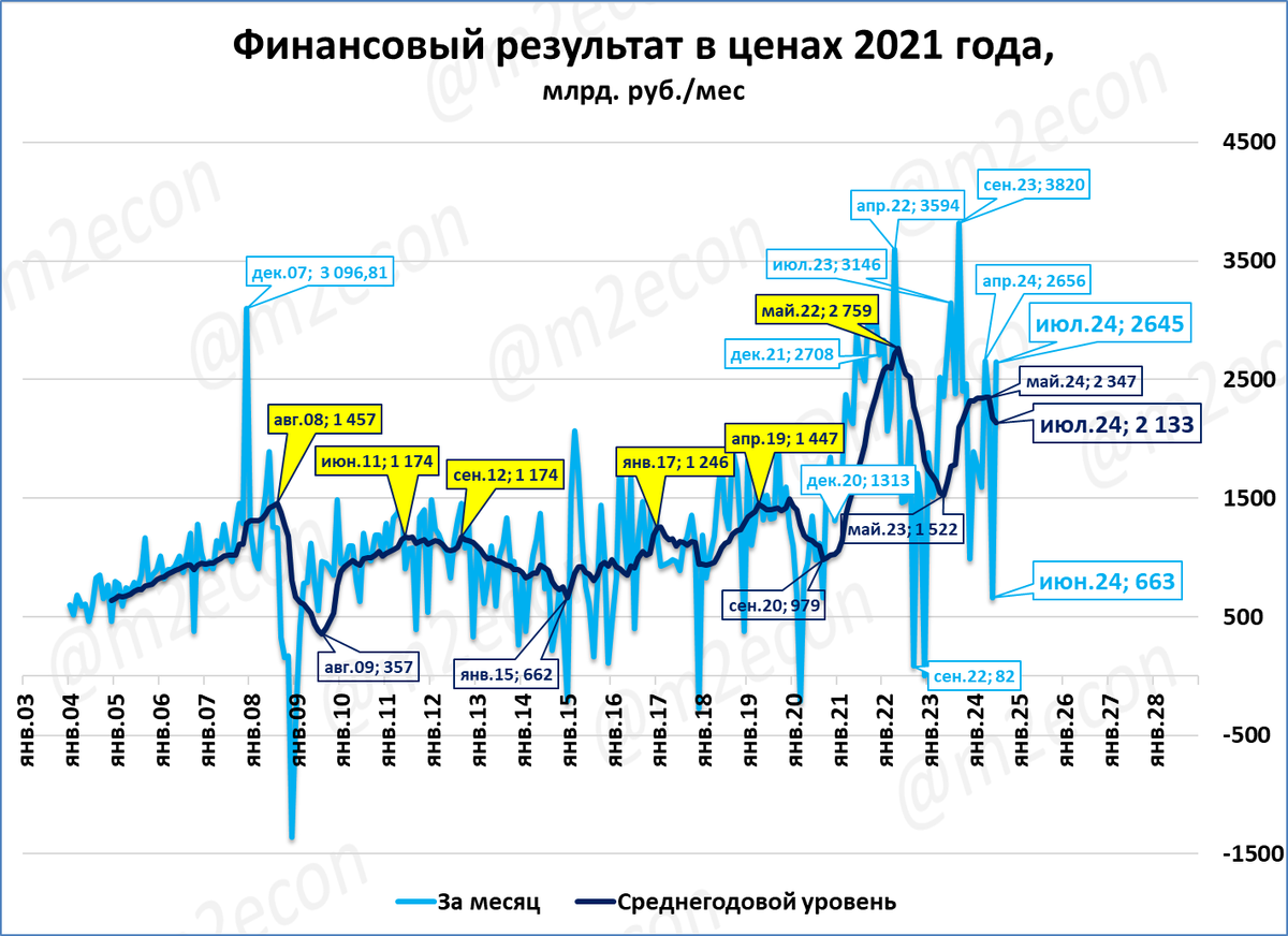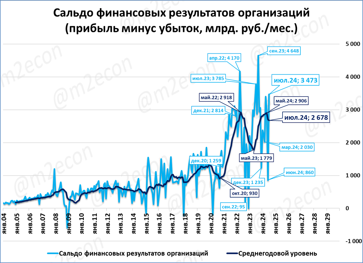 Прибыль предприятий* в июле приросла на приличные 3,5 трлн рублей. Это резкий рост по сравнению с просадкой в июне до 0,9 трлн.