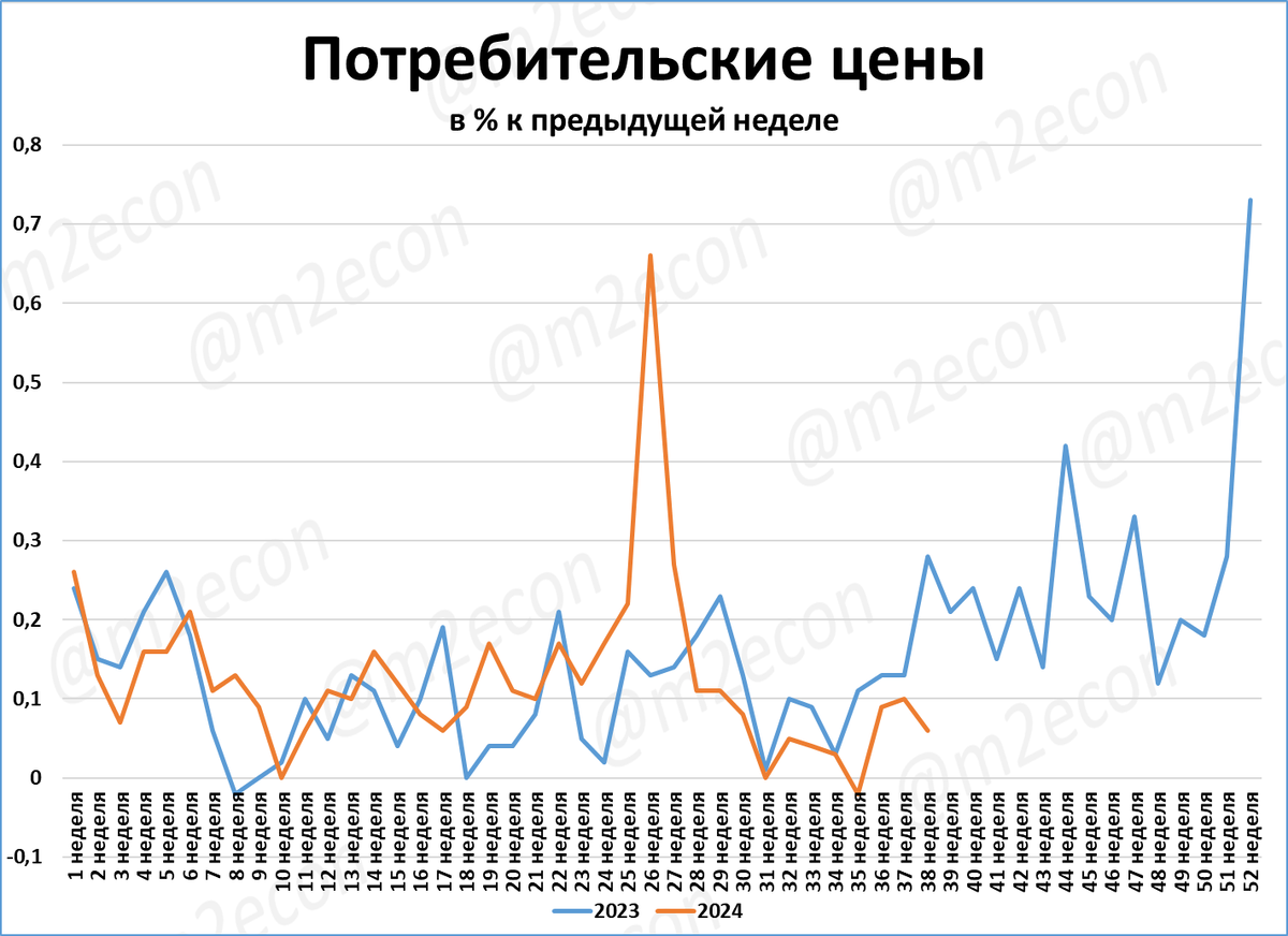 Рост цен за 38-ю неделю (0,06%) заметно меньше, чем за 38-ю неделю прошлого года (0,28%).