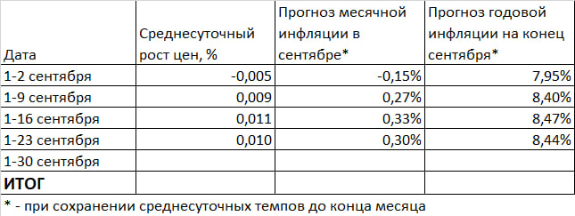 Если такой рост сохранится до конца месяца, то инфляция по итогам сентября составит 8,4% годовых.