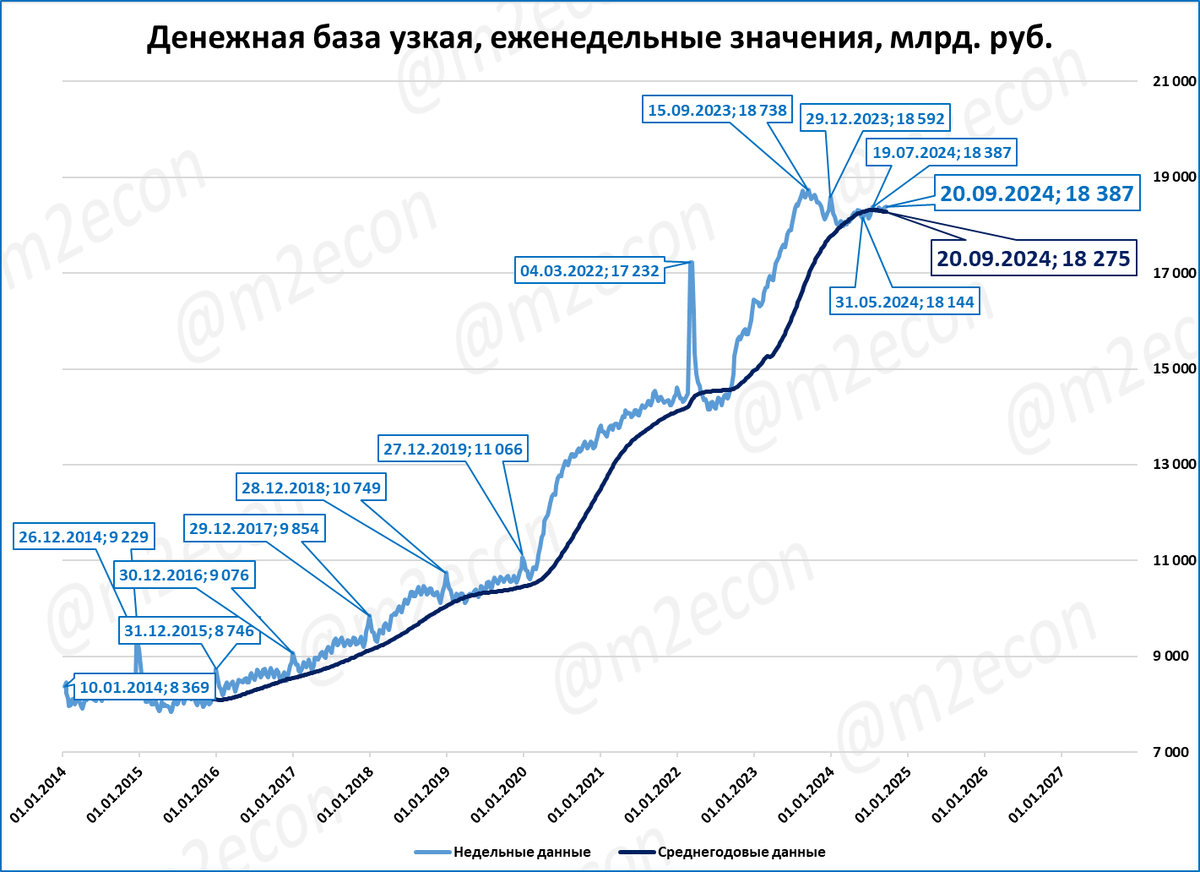 На 20 сентября узкая денежная база составила 18,4 трлн рублей.