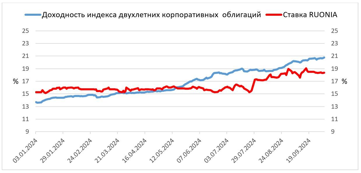 На графике ниже приведена динамика доходности индекса двухлетних облигаций с фиксированными купонами и ставки денежного рынка RUONIA, которая наряду с ключевой ставкой ЦБ является ориентиром для определения купонов у флоатеров. Как можно видеть, примерно с середины мая этого года доходность классических облигаций стала устойчиво превышать ставку RUONIA. Вначале это не сильно подмывало конкурентоспособность флоатеров, ведь, например, все корпоративные бумаги размещаются с определённой премией к референтной ставке. Однако по мере того, как разница между доходностями «фикса» и референтными ставками для флоатеров расширялась, инвесторы были вынуждены реагировать.