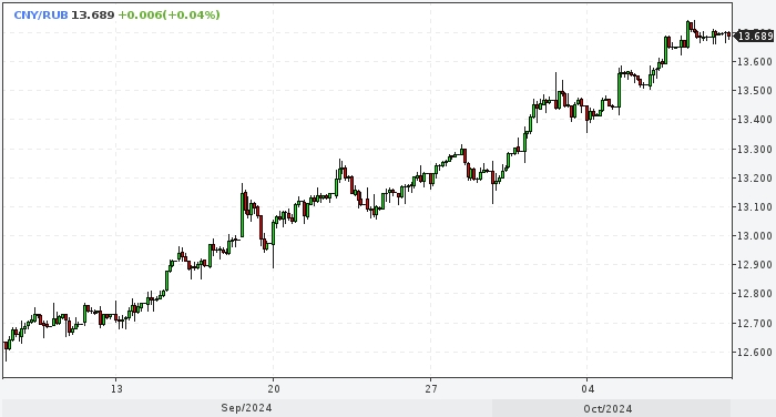 "Тем не менее полагаем, что по мере приближения к максимумам прошлого года, рост пары юань/рубль будет замедляться. Из факторов, которые могут сдерживать снижение курса рубля в среднесрочной перспективе, отметим планируемый рост нетто-продаж юаней со стороны ЦБ РФ с 0,2 млрд руб. в сентябре до 5,3 млрд руб. с 7 октября по 6 ноября 2024 года, дальнейшее ужесточение денежно-кредитных условий после заседания Банка России 25 октября и начало осеннего дивидендного сезона. На рынке Forex юань за последние четыре дня обозначил диапазон 7,05-7,10 юаней за доллар, усиление индекса доллара несколько приостановилось. В краткосрочной перспективе полагаем, что пара CNY/RUB удержится в диапазоне 13,6-13,9 руб. за юань".