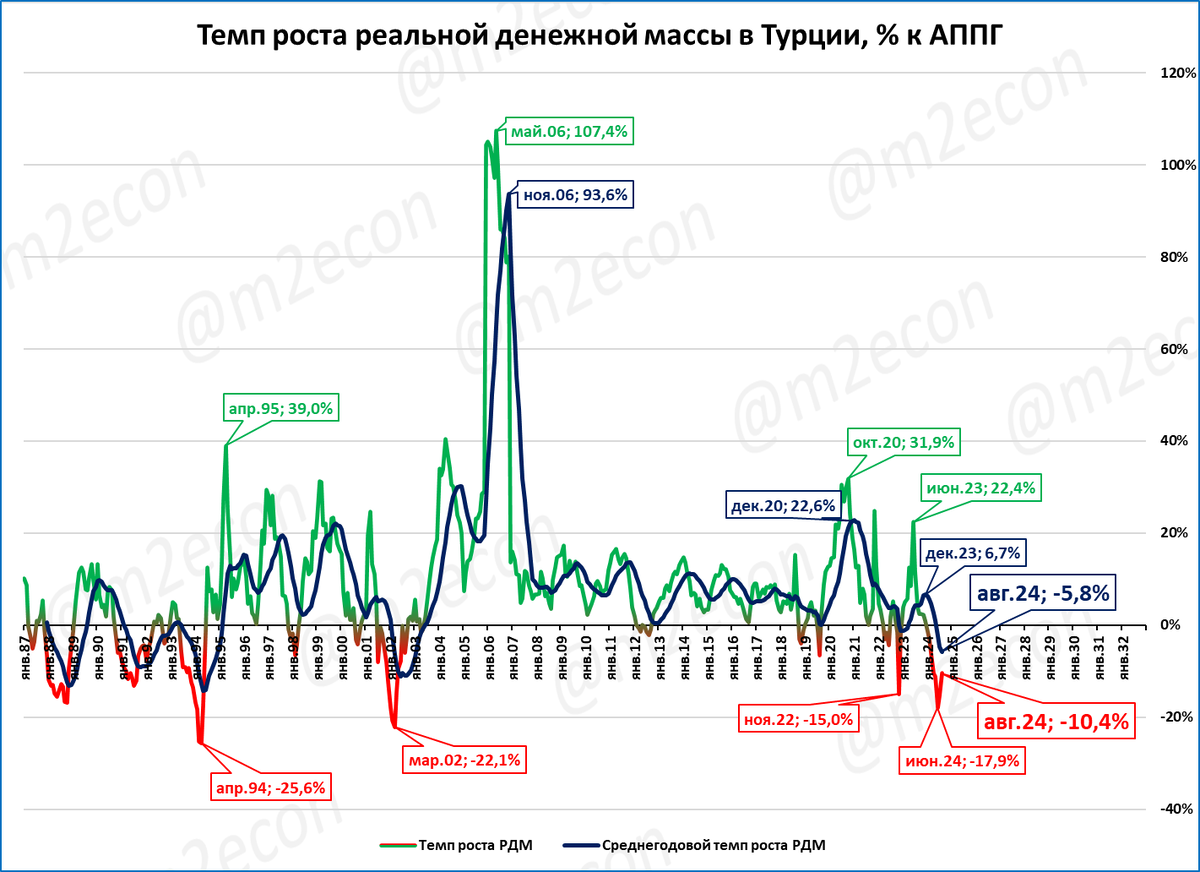 Турция: рост денежного агрегата М2 в номинальном выражении в августе замедлился до 36,1%. Поэтому, несмотря на снижение инфляции до 49%, в реальном выражении денежная масса упала на 10,4% по сравнению с прошлым годом. РДМ падает уже 8-й месяц подряд. Это может привести к падению ВВП Турции в течение ближайших кварталов.