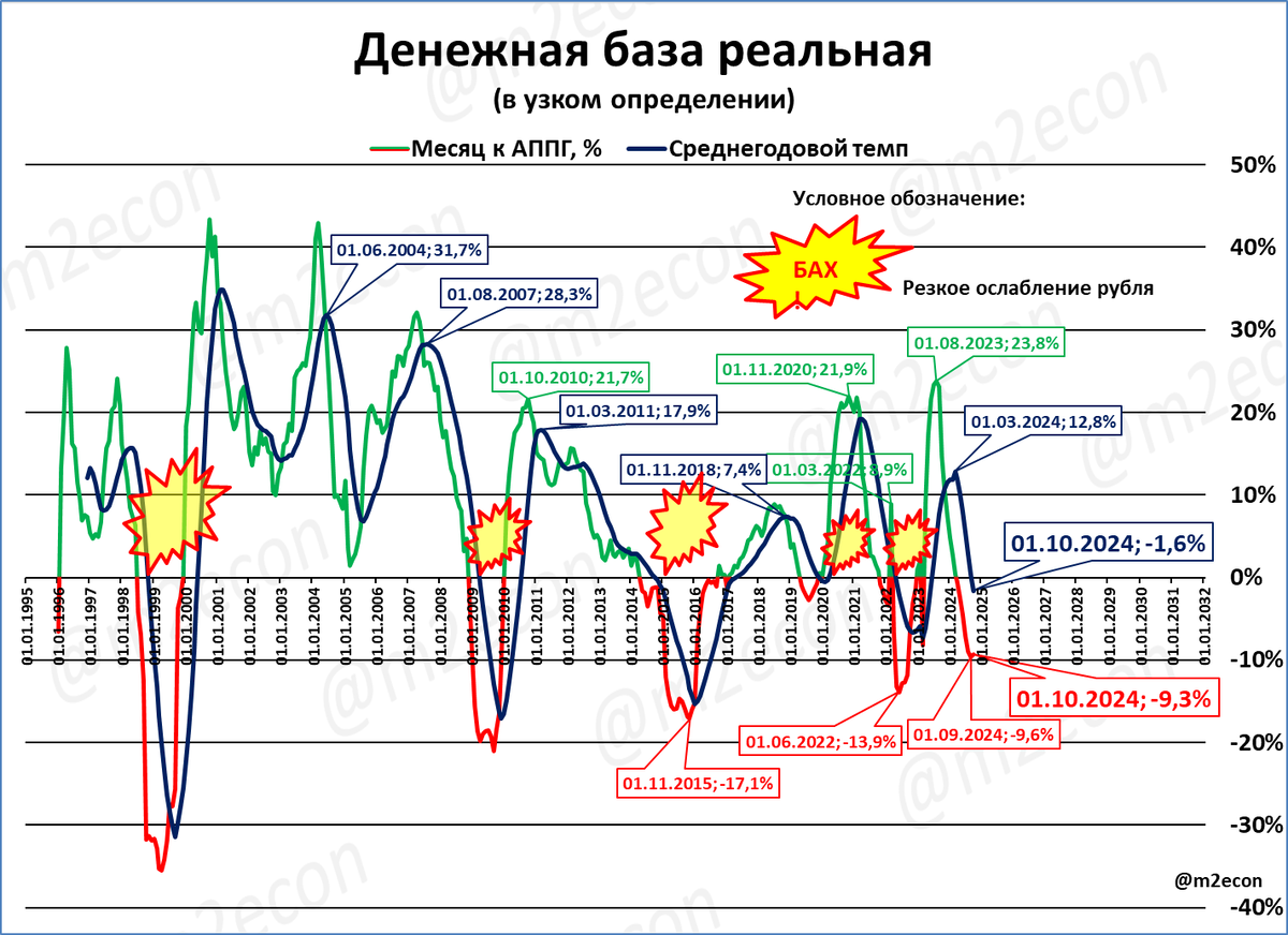 Ещё раз обратим ваше внимание: в прошлом падения узкой денежной базы близко по времени совпадали с резкими ослаблениями курса рубля.