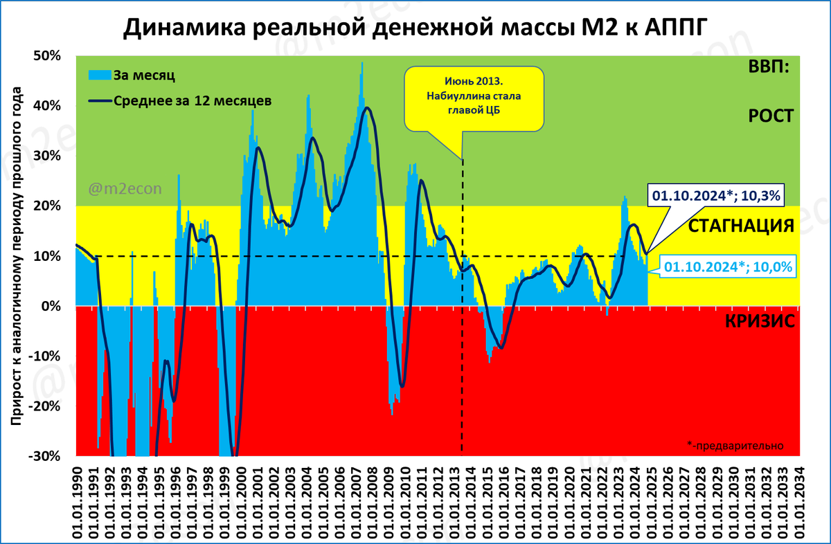 Напомним, что для быстрого и устойчивого роста ВВП необходим рост РДМ выше 20%. Именно такая динамика наблюдалась в 1999-2008 годах. Это наглядно видно на “денежном светофоре” со времён СССР.