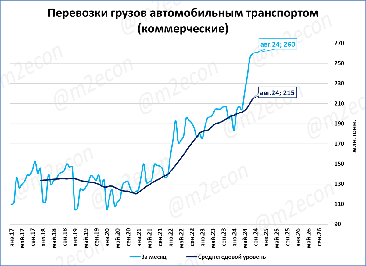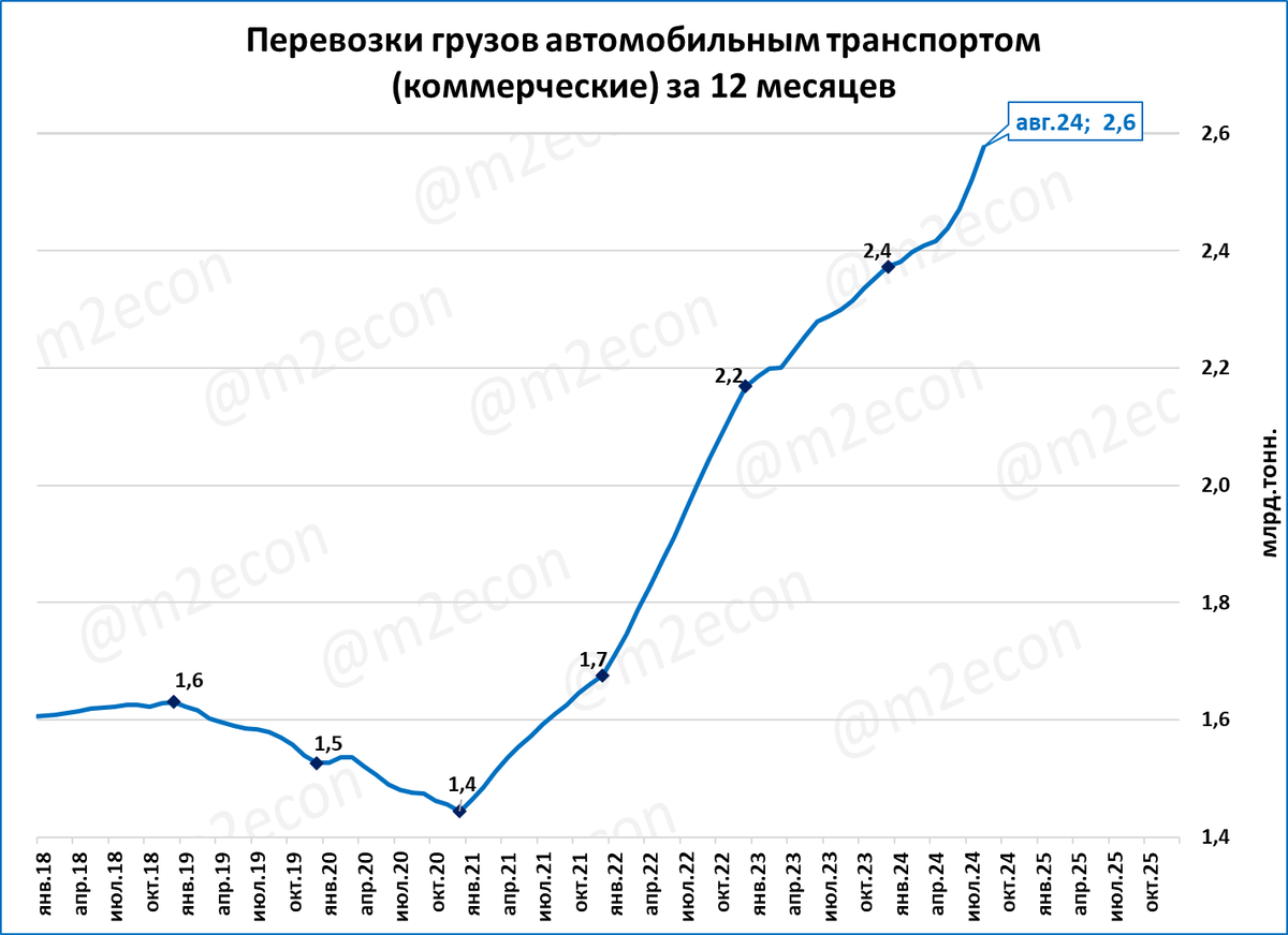 За последние 12 месяцев (скользящий год) коммерческим автотранспортом перевезли 2,6 млрд тонн.