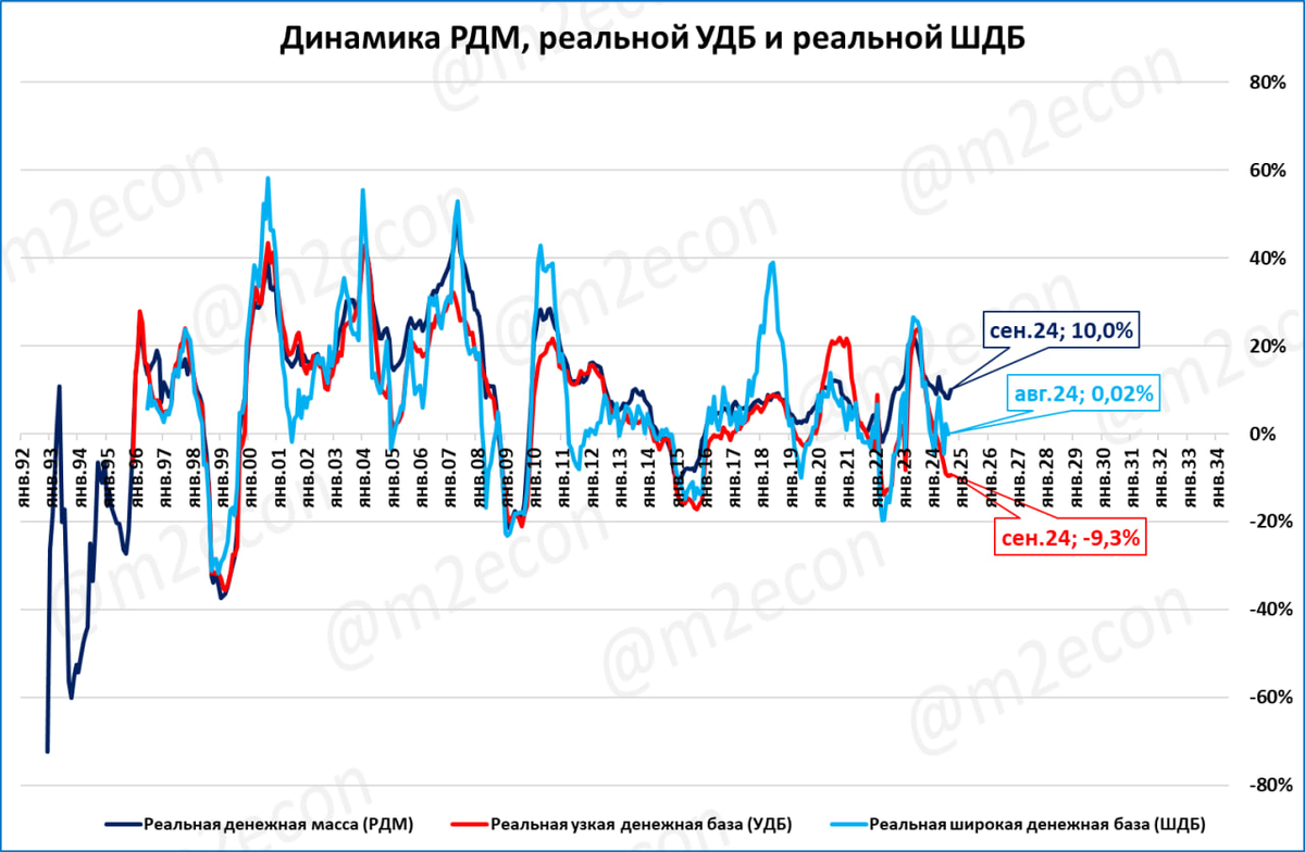 Узкая денежная база в реальном выражении сжимается, - 9,3% годовых по итогам сентября.
