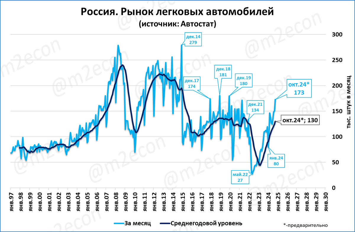 Судя по недельным данным, в октябре рынок легковых может составить 173 тысяч штук – лучший месяц с декабря «доковидного» 2019 года. Оценка итогов 2024 года повышается до 1,68 млн. То есть, рынок может стать лучшим за последние 10 лет. Но пока сложно оценить влияние ажиотажного спроса перед повышением утильсбора.