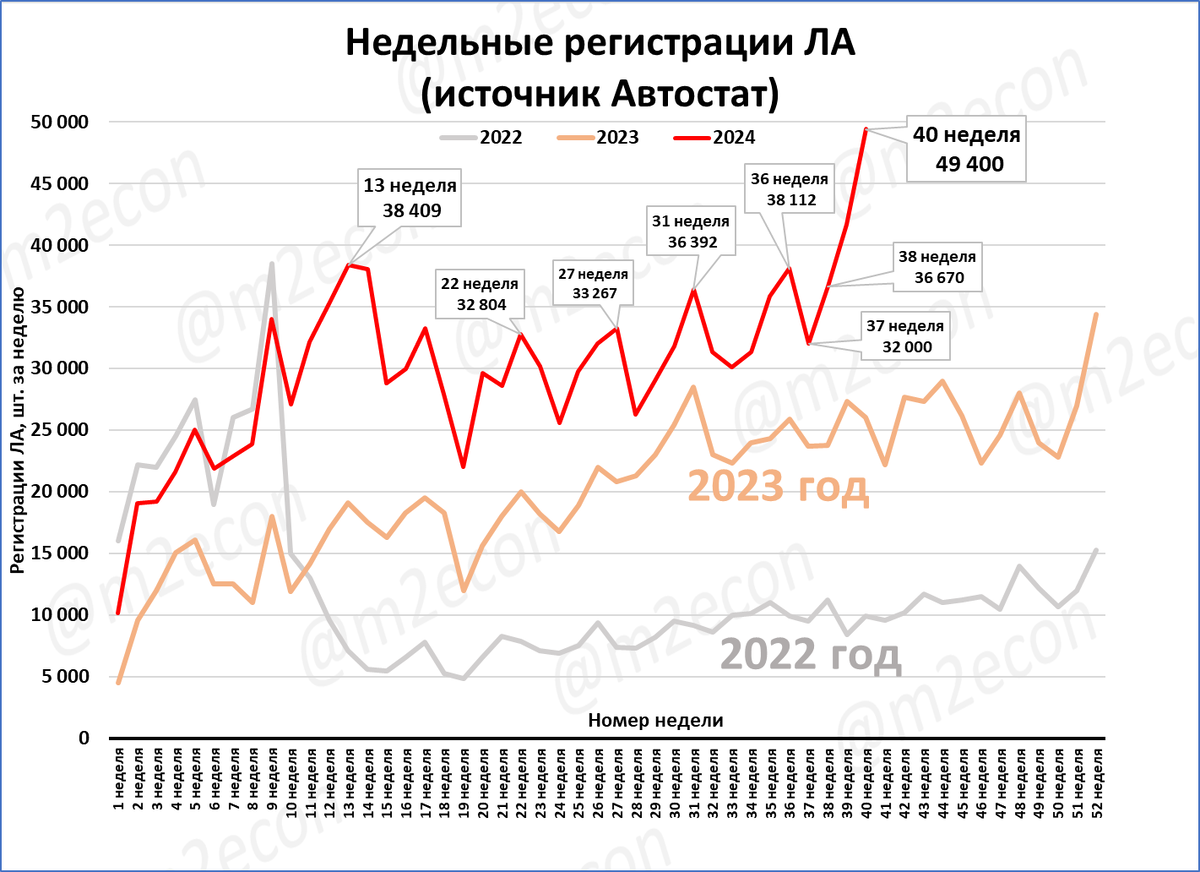 По предварительным данным, на 40 неделе в России было зарегистрировано 49,4 тыс. легковых автомобилей. Это лучшая неделя с тех пор, как Автостат публикует недельные данные (с 2022 года).